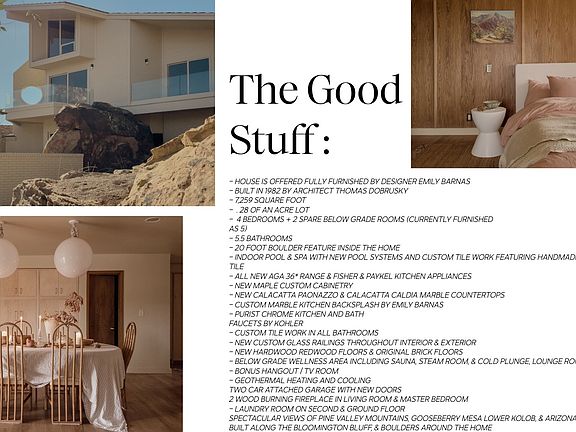 Kohler plumbing fixturesGeothermal heating and coolingPanoramic viewsZellige and cantera stoneCedar ceilingsMassive natural bouldersLow maintenance grounds