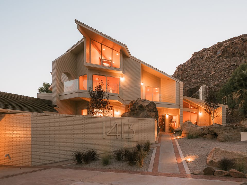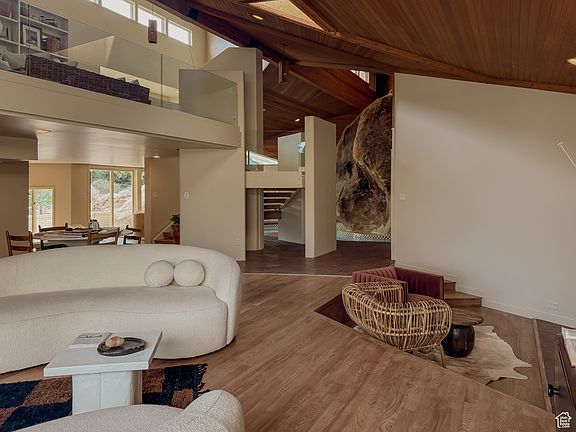 Carved into the side of the Bloomington Bluff, this 7,258 sq ft architectural statement was originally envisioned by architect Thomas A. Dobrusky and reimagined in 2025 by designer Emily Barnas.Built in 1982, the home reflects an earthy Postmodernism collected design, blending sculptural geometry with natural materials and a deep connection to its surroundings. Both daring and deeply livable, it embodies a wabi sabi ethos, raw, organic, and real, while delivering modern luxury that feels both grounded and alive. Massive natural boulders anchor the home's core, while soaring wood ceilings and transom windows invite soft desert light throughout. A dramatic indoor saltwater pool and spa curve around a 20 foot boulder centerpiece, where cedar ceilings, skylights, and glass railings fill the space with light and texture. Reimagined circulation and multi level vantage points make the architecture feel dynamic yet effortless. Signature features including a custom stained glass front door, two wood burning fireplaces, and hand finished details add warmth and artistry. A comprehensive 2025 renovation renewed nearly every surface: a newly designed Calacatta marble kitchen with high end appliances, spa inspired baths finished in Zellige and Cantera stone, new designer lighting, Kohler plumbing fixtures, and redwood hardwood floors throughout. A private wellness retreat offers a dry sauna, steam room, and cold plunge for effortless recovery and relaxation. Expansive indoor outdoor connections create a natural flow for entertaining, while geothermal heating and cooling ensure year round comfort. Fully furnished and curated by designer Emily Barnas, every piece was hand selected to complement the home's natural textures and tones. With low maintenance grounds, no HOA, and panoramic views of Pine Valley Mountain, Gooseberry Mesa, and the Arizona Strip. Both art and refuge, House No1413 invites you to live boldly and rest deeply.