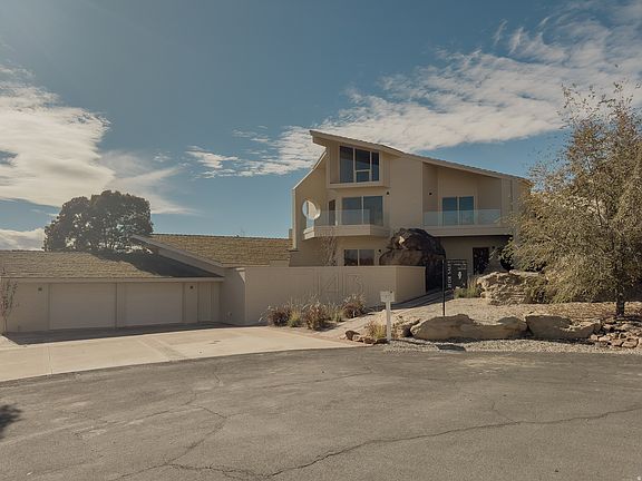 Offered fully furnished by designer Emily Barnas, this rare 7,258 sq ft architectural residence is carved into the Bloomington Bluff, an earthy postmodern statement thoughtfully reimagined in 2025 with both soul and restraint. Originally envisioned by architect Thomas A. Dobrusky in 1982, the home celebrates sculptural geometry, cedar warmth, and the glow of desert light. The result is a bold yet livable fusion of art, architecture, and quiet luxury. Massive natural boulders anchor the home's core, while soaring wood ceilings and transom windows invite soft desert light throughout. A dramatic indoor saltwater pool and spa curve around a 20 foot boulder centerpiece, where cedar ceilings, skylights, and glass railings fill the space with light and texture. Reimagined circulation and multi level vantage points make the architecture feel dynamic yet effortless. Signature features including a custom stained glass front door, two wood burning fireplaces, and hand finished details add warmth and artistry. A comprehensive 2025 renovation renewed nearly every surface: a newly designed Calacatta marble kitchen with high end appliances, spa inspired baths finished in Zellige and Cantera stone, new designer lighting, Kohler plumbing fixtures, and redwood hardwood floors throughout. A private wellness retreat offers a dry sauna, steam room, and cold plunge for effortless recovery and relaxation. Expansive indoor outdoor connections create a natural flow for entertaining, while geothermal heating and cooling ensure year round comfort. Fully furnished and curated by designer Emily Barnas, every piece was hand selected to complement the home's natural textures and tones. With low maintenance grounds, no HOA, and panoramic views of Pine Valley Mountain, Gooseberry Mesa, and the Arizona Strip. Both art and refuge, House No1413 invites you to live boldly and rest deeply.