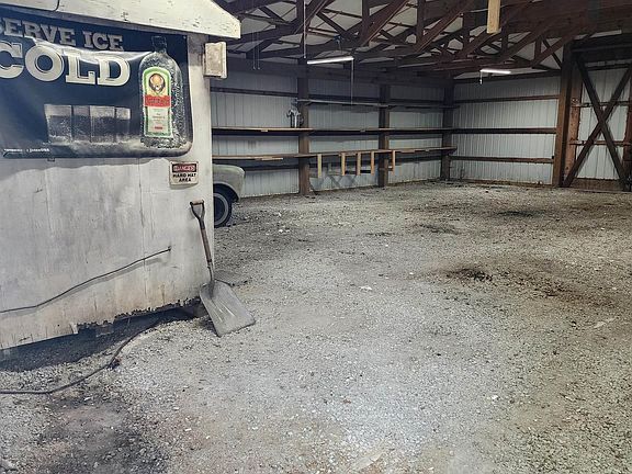48 x 50 Pole Barn on corner lot. Lot has full water and sewer hookup already in place. 300 AMP service, 300 Sq Ft of heavy duty shelving, 14 foot rafters, 10 x 14 foot opening door on alley, fully connected to city water and sewer, independent double basin sink, 30 AMP service outlets for campers (x2), Flue for furnace already installed, air outlets already installed (x5) Ceiling fans (x3), shop lights (x10), 110 outlets on every pole (x16), 220 outlets (x3), Floor drain connected to city water, Bathroom with 220 electric heat, toilet, sink, storage.