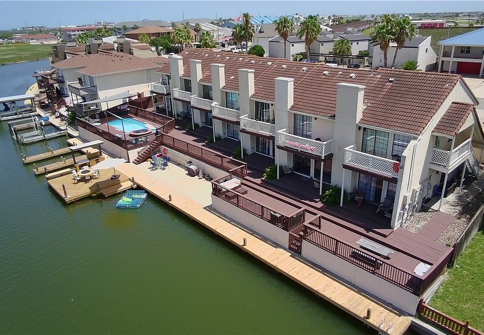 Beautiful well maintained waterfront property consisting of 9 custom condominiums. This unit has 1 bedroom and 1 bath. Spacious floorplan and has a built in desk for remote workers. Recently renovated with beautiful granite, paint and other updates. Fully furnished. This coastal property is located on N. Padre Island & has some of the best sunsets in the world. Access to a shared pool / hot tub, and ample outdoor space. The complex has hundreds of feet of waterfront for fishing and a beautiful newly built deck,dock, cleaning station and boatslips. Come enjoy a piece of paradise that boasts breathtaking water views & world class fishing. A golf cart ride away to the beach & fresh seafood restaurants. Contact me for a rental application and I have 4 other units for rent as well w/different color schemes.