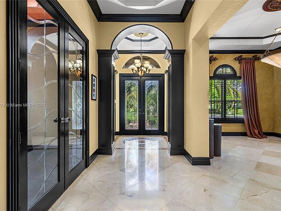 Experience peace and sophistication in the exclusive gated community of Saddlebrook in Davie. This stunning residence features 6 bedrooms and 5 bathrooms. The spacious master suite includes custom walk-in closets and a versatile sitting area perfect for a home office or gym. Elegant marble and hardwood flooring complement the custom window treatments throughout. The open-concept kitchen boasts stainless steel appliances and connects seamlessly to the formal dining and living areas Enjoy the outdoor patio with a built-in BBQ area, pool, and jacuzzi perfect for relaxing in your own retreat. Located on a quiet cul-de-sac, this property offers both safety and serenity. Conveniently close to Vista View Park and top-rated public and private schools.Complete hurricane protection included
