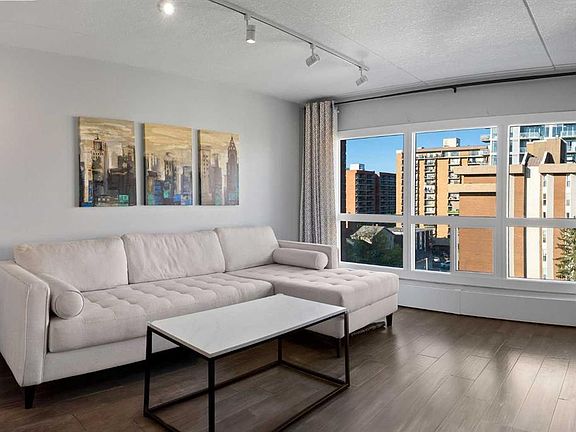 Welcome to this beautifully updated 1 bedroom condo in one of downtown Calgary’s most vibrant communities. Situated on the TOP FLOOR of a well-managed, adults-only building, this WEST-FACING CORNER UNIT is filled with natural light and offers peace, quiet, and stunning city views. Step inside to find a FULLY RENOVATED KITCHEN featuring crisp white cabinetry, granite countertops, and stainless steel appliances. The bathroom has also been tastefully redone, complementing the modern feel throughout. EENGINEERED HARDWOOD and elegant tile flooring run seamlessly through the home, while the bright and spacious bedroom easily accommodates a king-sized bed. Convenient IN-SUITE LAUNDRY makes everyday living effortless. Relax on your private balcony overlooking the downtown skyline. Recent building upgrades include NEW TRIPLE-PANE WINDOWS and refreshed balconies, ensuring year-round comfort and tranquility. This home also comes complete with a HEATED UNDERGROUND PARKING STALL and an OVERSIZED STORAGE LOCKER—rare finds in the core. The building is PET-FRIENDLY, so your furry companion is welcome, too. Step outside and enjoy everything the Beltline has to offer—trendy cafés, acclaimed restaurants, boutique shops, fitness studios, and vibrant nightlife are all just blocks away. With easy access to 17th Avenue, Stampede Park, bike paths, and transit, this location truly puts the best of Calgary at your doorstep.