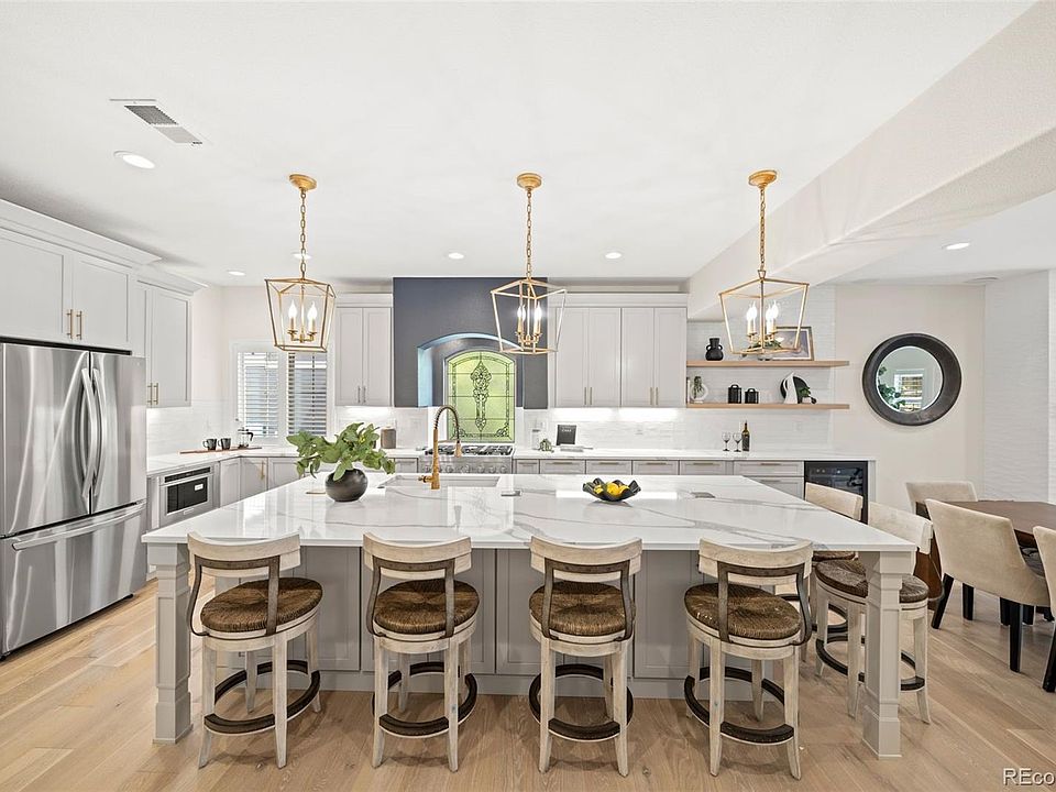 At the heart of the home lies a gourmet kitchen that will impress even the most discerning chef—with a massive island that comfortably seats six, brand-new stainless steel appliances, a wine fridge, soft-close cabinetry with open shelving, gorgeous pendant lighting, and recessed lighting throughout. Whether you're preparing a feast or simply enjoying a glass of wine with friends, this space is as functional as it is beautiful.