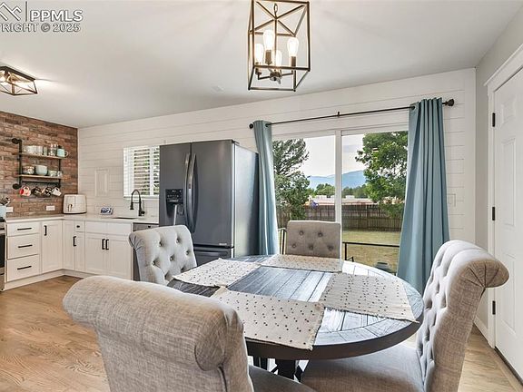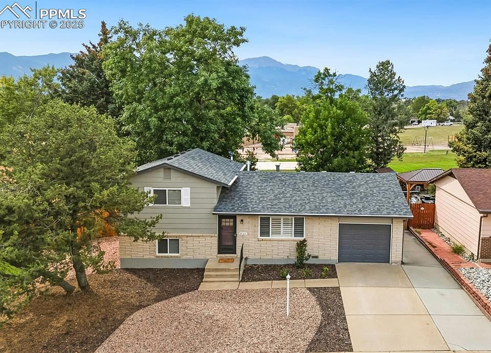 Beautifully Remodeled Home with Stunning Mountain Views! Nestled on a charming, tree-lined street, this wonderfully updated home blends timeless character with modern style! The bright, open main level features a stunning kitchen with white cabinetry, quartz countertops, gas stove, stainless steel appliances—including a new matte black refrigerator—and stylish brick and shiplap accents! Plantation shutters, refinished hardwood floors and neutral, inviting colors create a warm, welcoming feel! From the Kitchen, Dining Room and Backyard, enjoy Breathtaking, Unobstructed Views of Pikes Peak! With no rear neighbors and backing to a school, privacy and views are unmatched! The spacious, fully fenced backyard with rear gate access is perfect for entertaining, summer BBQs, pets or simply soaking in Colorado’s fresh air! Upstairs offers a serene primary bedroom, guest room, and updated full bathroom! The lower level adds versatility with a third bedroom (ideal as a home office, game room, or playroom), a generous second living space, laundry (washer & dryer included) and an updated second bathroom! Major updates include a New Furnace and AC (2024), New Roof (2022), Newer Water Heater (2020), New Windows with built-in doggie door, Gutter Guards and Radon mitigation system! Additional features include Xeriscape front yard, ADT security system with Google doorbell, and front and rear cameras! With its stylish modern finishes, thoughtful upgrades, and Move-In Ready condition, this home has it all! Schedule your showing today—WELCOME HOME