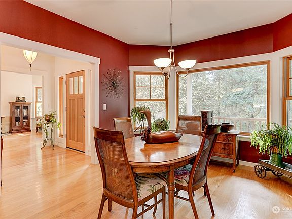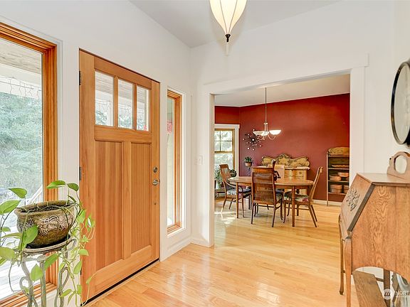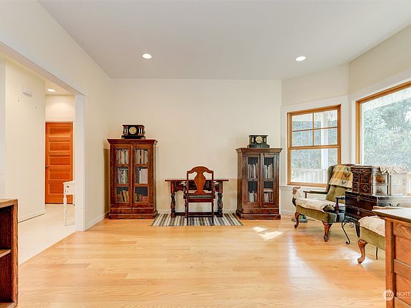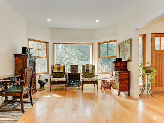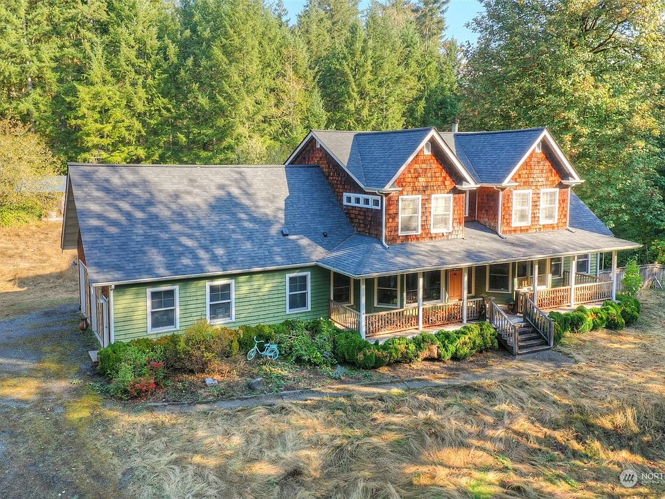 Charming craftsman farmhouse with a Victorian feel. Greeted by a dramatic river rock fireplace, exposed wood beams, soaring vaulted ceilings, oak floors, wood panel doors & wood wrapped windows - this 4 bed floor plan is exceptional w/a light & bright Corian kitchen, generous sized primary bedroom en-suite w/ dual walk in closets, airy upstairs landing/loft & bonus room. Exterior boasts a brand new roof, cedar siding, covered front porch & extensive back deck. Wired for a generator, water filtration & a heat pump for year round comfort. Situated on over 8 acres, this private lot allows space for RV parking (RV hookups), multiple outbuildings + chicken coops & possibly a shop (with county approval). Wildlife abounds!