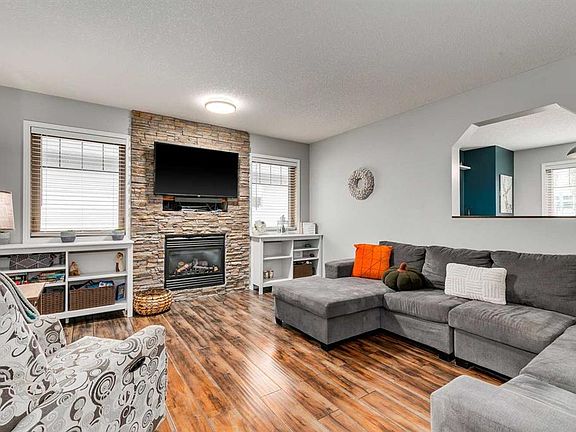 This thoughtfully cared-for home combines comfort with a touch of refined living. The main floor offers a separate front living room anchored by a beautiful stone-faced fireplace, an inviting feature that sets a warm and elegant tone. The kitchen blends practicality and style with oak cabinetry, a centre island, corner pantry, a window over the sink overlooking the backyard, and flows seamlessly into the spacious dining area. A 2-piece bath, laundry, and mudroom complete this level. Upstairs, the primary suite feels like a private retreat with its walk-in closet and 4-piece ensuite, while two additional bedrooms share a full bathroom. A custom built-in desk in the upper hallway provides a dedicated space for work or study. Outside, the fenced backyard includes raised garden beds and a side garden, offering a wonderful ready made space to start your own garden. The oversized driveway and double attached garage provide ample parking. Ideally located in the family-friendly community of Crossfield, this home is just one block from a local park and within minutes of schools, shops, and recreational amenities—while only a short drive to Airdrie or Calgary.