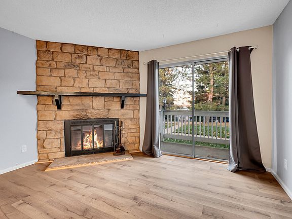 As you enter, you'll be greeted by an open living room featuring a charming stone fireplace and access to a private patioperfect for relaxing or entertaining. Straight ahead, the kitchen offers plenty of cabinet space and includes a dishwasher, stove, oven, and refrigerator. Down the hall, you'll find two bedrooms, including the primary bedroom. Both bedrooms have access to two full bathrooms, and there's a laundry room with a washer and dryer for added convenience. Additional features include central A/C, one garage spot and one assigned uncovered parking space.