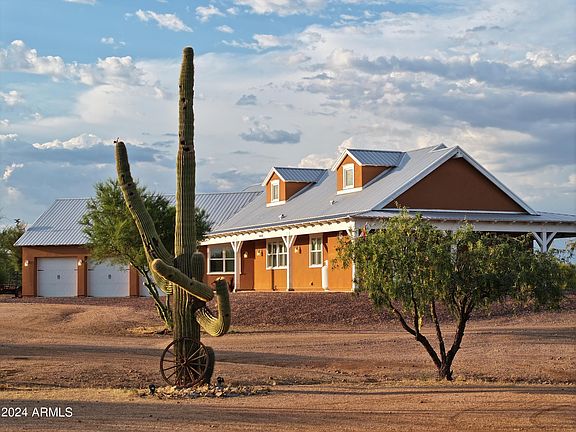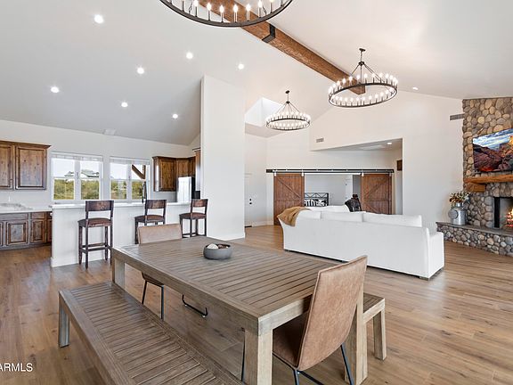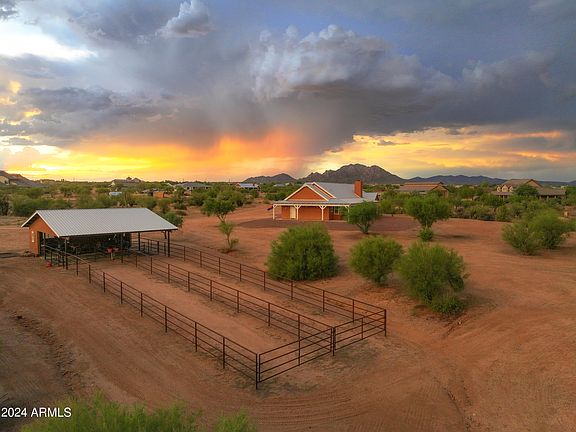 Welcome to The Ranch, y'all! This RENOVATED dream property is being sold FULLY FURNISHED, so all you need to do is bring your horses, cowboy boots/hats and your suitcases! Priced BELOW recent appraisal! You'll access the property by all paved roads, except for about 150 yards of dirt plus your long driveway. You'll feel like you're pulling up to a Wild West movie set when you drive up to the ranch and see such unique architecture, the metal roof, the wraparound porch, the horse barn/facilities and more, ALL on sprawling 3.26 acres with breathtaking, 360-degree mountain views, including views of Four Peaks, Weavers Needle, Tom's Thumb and many more. Water is GOLD in Arizona, and you'll feel like you struck gold with the high-producing water well that is kicking out 7 gallons... ... per minute of beautiful, clean, high-pressure water. This 3 bed, 2 bathroom home was renovated with an elevated and refined balance of rustic and modern: Check out the new showstopper Quartz countertops throughout (kitchen, bathrooms and laundry). The kitchen has been reconfigured to offer a more luxurious cooking experience with a new 48-inch dual fuel double oven range (electric ovens and gas burners), in addition to a black Quartz Elkay sink with a matte black faucet and a matching black disposal air switch button. Enjoy the new refrigerator with a built-in beverage center, a new Dacor dishwasher and a brand new, sleek black washer and dryer with copper accent colors. The cabinets throughout the home are a custom, rustic alder from SOLLID Cabinetry. The living room and dining room have The WOW Factor, with gigantic round chandeliers that light up the entire space. The ceilings soar to 16 feet, with a massive 10 x 10 x 32 foot rustic beam running down the middle of the vault. The wall of windows and sliding doors reveal absolutely breathtaking mountain views and wide open space, that will soon be your backyard! The river rock stone fireplace and custom rustic mantel will surely be a cozy setting and a conversation starter for your next gathering. Both bathrooms have been completely remodeled and enhanced, featuring new floor-to-ceiling tiled showers with wall-mounted waterfall heads and hand-held wands, striking LED front-lit and backlit mirrors with color temperature customization, anti-fog and dimming. Both bathrooms also have new toilets, sinks, faucets, towel bars/hooks, vanity lights and more. The primary shower offers DOUBLE wall-mounted waterfall heads and wands, so two can shower at the same time! A new LED bluetooth exhaust fan was added, so you can listen to music while you shower. It also has night lights with two color options. Custom shower glass was installed in both bathrooms, with floor-to-ceiling glass panels in the primary. This home has a lot of storage. There are two pantries, a bonus storage room, and the primary bedroom and guest bedroom have enormous walk-in closets. The flooring has been updated throughout the entire home with a wood-based plank flooring that is warm and inviting, along with all new crisp and clean 6-inch baseboards. The primary bedroom and one of the guest bedrooms now feature newly constructed bump-out electric fireplaces with customizable flame colors, heat, wood-crackling sound effects and custom wood mantels. The third bedroom showcases newly constructed dual closets, a custom live edge wood floating desk, with a black floating shelf and a Limousine Leather black slat accent wall. The views from every single window are stunning, especially from the bedrooms. Your guests will be fighting over who has the best view! The ranch features all new LED lighting, ceiling fans, light fixtures, black hinges and handles on the doors and many more intricate details. Custom carpentry is evident throughout the home, with so many eye-catching wood accents. The home comes equipped with a brand new electric water heater and whole-home water filtration system featuring burnt coconut shells and a new water softener that will leave your skin and hair feeling silky smooth. The MASSIVELY oversized 3-car garage was just painted. Seriously, it feels much bigger than a 3-car garage. While you're in the garage, don't miss the pull down ladder to go up into the attic. It offers a ton of storage and is the size of a huge bedroom/playroom. The home is insulated with spray foam, so it's super sealed, quiet, and energy efficient. Outside, the land feels never ending as you walk the property, with room to add onto the main home or build anything your heart desires! You name it, you can build it with all the extra land/space you will have. Take in all the magical views as you sit in the rocking chairs on your wraparound porch. And just WAIT until you hear the incredible sound of rain hitting the metal roof. Talk about a good night's sleep! Kick back under the stars, build a fire in the distant fire pit, and fully embrace living on the ranch.