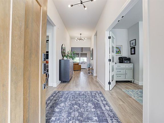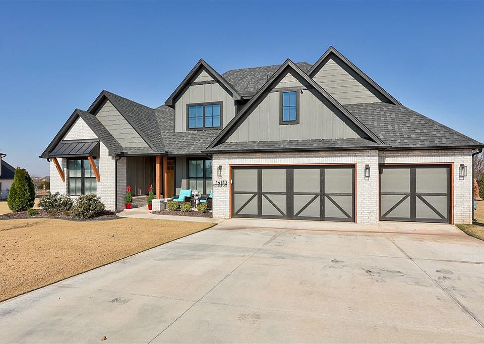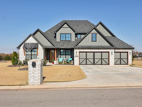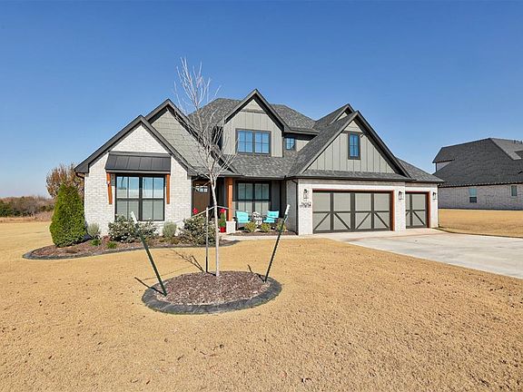 Welcome home to this outstanding residence in Edmond, situated on just under an acre lot that overlooks a serene greenbelt. As you walk up to the home, you are greeted by lovely curb appeal & an oversized three-car garage, which sets the tone for this thoughtfully designed property. The backyard features an extended patio with custom louvered enclosure that provides both privacy & airflow, complete with a durable metal roof—an ideal setting for relaxing evenings, even on rainy days. Inside, a stunning entryway introduces you to the grand great room, showcasing vaulted ceilings with striking wood beams that seamlessly flow into the kitchen. The chef’s kitchen offers beautiful stainless-steel appliances, convenient coffee bar, large center island with countertop-height seating, walk-in pantry, a statement backsplash, stylish cabinets with contrasting wood vent hood & an overall custom feel that remains warm and inviting. Custom Roman shades enhance the windows while allowing you to easily control natural light throughout the day. The primary suite is a true retreat, highlighted by a wood-paneled ceiling & a luxurious en-suite bath featuring dual vanities, a soaking tub framed by a privacy window, spacious walk-in shower w/ dual shower heads, a private water closet & a vaulted ceiling adorned w/ a chandelier for an elevated touch. The expansive primary closet offers floor-to-ceiling hanging space and connects directly to the well-appointed laundry room, complete with ample storage, washer/dryer space, & a utility sink. Secondary bedrooms are located on the opposite side of the home, each offering generous closet space, abundant natural light, and a calm, welcoming atmosphere—perfect for family or guests. A spacious secondary bathroom is nestled between two of the secondary bedrooms & has a stunning tile shower surround, spacious vanity with timeless touches, w/ a half bath just off the living room for ease! This stunning home checks every box—you won’t want to miss it!