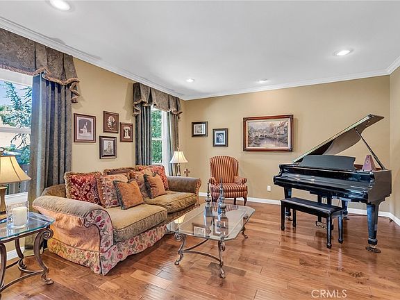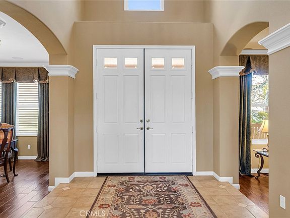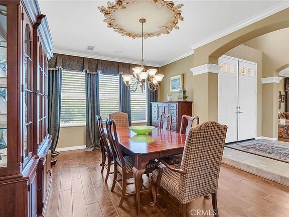 CRYSTAL RIDGE ESTATES-Welcome to 14143 Ashton Lane, a distinguished residence nestled in the serene landscapes of Riverside, CA. This popular plan 3 model offers a harmonious blend of luxury and comfort, spanning an impressive 3,700 square feet. Upon entering, you are greeted by the warmth of walnut wood flooring that flows seamlessly throughout the formal living and dining rooms, setting the stage for refined gatherings. The heart of the home is the expansive family room, adorned with a cozy fireplace, which effortlessly connects to a game room and bar area, perfect for entertaining. The gourmet kitchen, replete with modern amenities, serves as a culinary haven for the discerning chef. Retreat to the master suite, where a private fireplace adds a touch of romance. The updated master bathroom features a large shower and custom closet organizers, providing a sanctuary of relaxation. Three additional bedrooms offer ample space for family and guests, while a loft office space upstairs caters to your professional needs.Step outside to an entertainer's dream backyard, where a vanishing edge pool offers breathtaking mountain views, creating a tranquil oasis. The expansive lot of over 30,000 square feet ensures privacy and endless possibilities for outdoor enjoyment. 4 car garage, wtih epoxy flooring and ample storage space. This home is a testament to sophisticated living, with built-ins throughout that enhance both form and function. Discover the epitome of elegance at 14143 Ashton Lane.
