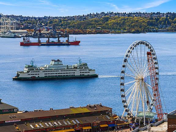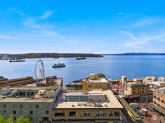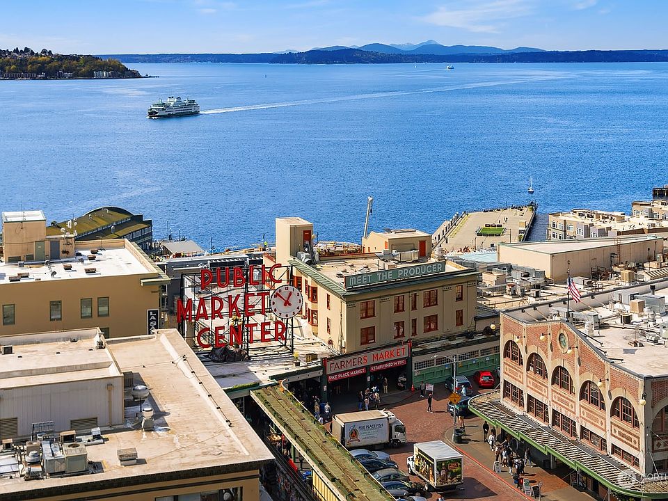 Iconic Seattle views can be yours from this 12th floor condo in beautiful Newmark Tower. Large windows capture the ferries crossing Elliot Bay, Pike Place Market and the waterfront from your balcony. Sunsets galore from this west facing unit, yet comfortably AC cooled when needed. Walkable to everywhere downtown, from stadiums to the waterfront to Benaroya Hall to the Seattle Art Museum, this secure building has a 24 hour on-site concierge, indoor pool/spa, exercise room, business center and 5th floor deck overlooking the Sound. Could be a fabulous investment as a short term high demand rental. Water/sewer/garbage included in dues plus storage unit and secure garage. Target is just downstairs. It doesn't get more Seattle than this.