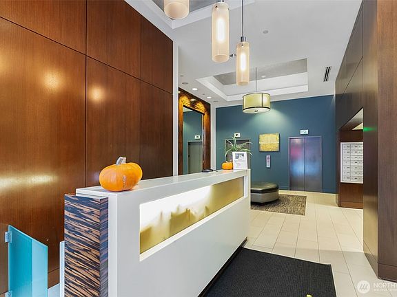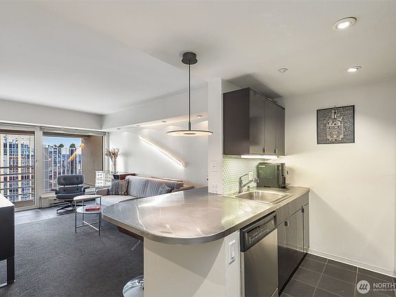 High on the 21st floor of Newmark Tower, a block from Pike Place Market and the Seattle waterfront, this 1-bedroom, 1-bath condo features south-facing floor-to-ceiling windows with city and partial Puget Sound views. Efficient layout with black slate floors and Juliet balcony. Amenities include 24-hour concierge, indoor pool, hot tub, sauna, gym, showers, outdoor decks, party room, guest suite, business center, storage, and garage parking. With Target on the ground floor, daily essentials are at your doorstep. Two blocks to light rail! Investor- and part-time owner-friendly building with short-term stays allowed and no rental cap. In time for the 2026 World Cup, this home captures easy living and downtown energy in one exceptional address.