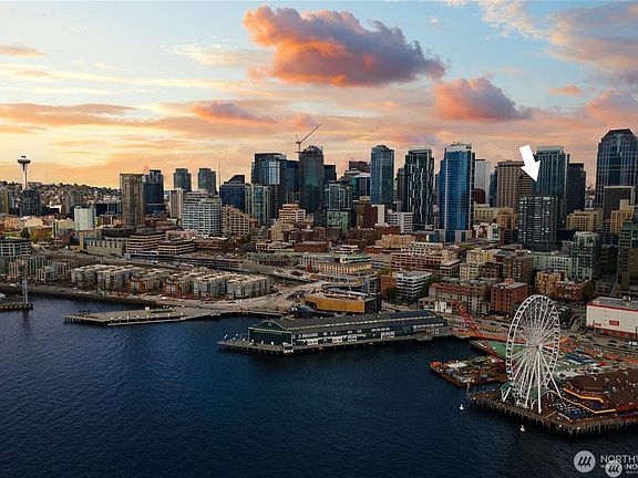 Live in the skies of Seattle: Step into this light-filled, top-floor condo & you'll captivated by breathtaking, unobstructed west-facing views of the Puget Sound, Olympic Mountains, & sparkling waterfront—truly the best views in all of Seattle. Inside you'll find soaring ceilings, new flooring & paint, a spacious open-concept layout, & a stylishly updated kitchen w/ quartz counters & SS appliances, PLUS AC! The bedroom offers panoramic views & dual closets W/system. In-unit washer/dryer, solar shades, secure parking w/EV charging potential & storage. Amenities: 24-hour concierge, pool, hot tub, sauna, gym, view deck, guest suite, Airbnbs Allowed. Steps to Pike Place Market, light rail, Benaroya Hall, Showbox, & top restaurants & more!