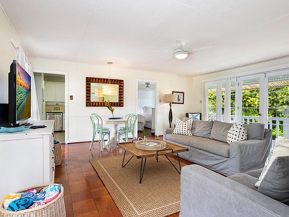 The main house at Lanikai Cottage includes two bedrooms and one bathroom, a well-equipped kitchen, a dining area, and a living space that opens to the back yard. The guest house contains an additional bedroom and bathroom, as well as a partial kitchen, living room, and lovely lanai with a peek-a-boo ocean view. Guests will appreciate having all the comforts of home, including flat-screen televisions, Wi-Fi, and a washer and dryer.