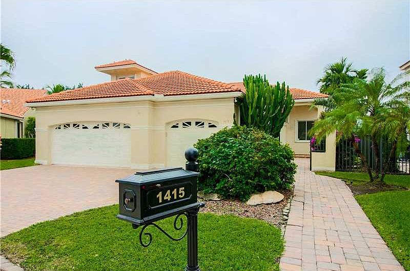 Expanded from its original layout, home features 4 bedrooms in 1st floor + exercise/yoga room upstairs and 3.5 baths. Outside an additional full Cabana bath and storage by the Summer Kitchen. All laminate wood floor, renovated kitchen and accordion shutters. Enjoy sunsets from the jacuzzi or with a drink at the huge pool deck / terrace by the lake. This large lot is in a mini cul-de-sac. 3 car garage. Walk to Weston's Town Center from The Islands. Very well priced and a motivated seller.