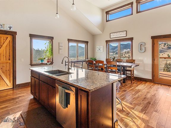 This custom home was built in 2015 and is stunning as it sits up against the rock formations. The huge front deck overlooks the mountain ranges around Southwest Montana. It's the perfect place to view the wildlife, including the large elk herd that makes their home there in the Winter months. The kitchen has tons of counter space with granite countertops and a large walk-in pantry. The open-concept living area has a propane fireplace for those cozy lazy days. The Master bedroom has direct access to the deck and has a nice walk-in closet. The master bathroom has a large walk-in shower. Downstairs you will find a large rec room with a wood stove and beautiful wood ceilings. The three additional bedrooms are large and there is an additional bonus room currently being used as an in-home gym. The walk-out basement is also plumbed for a bar and the outdoor patio is plumbed for a hot tub. Only minutes away from Fairmont Hot Springs Resort!