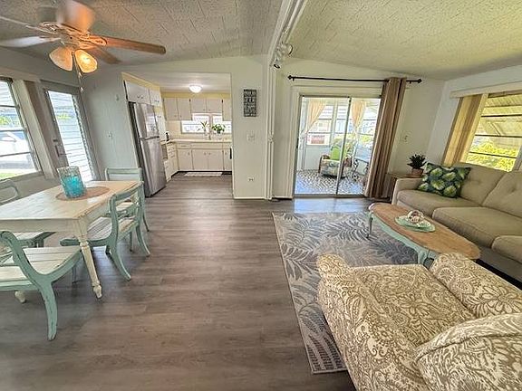 Situated on Florida's West Coast, in the heart of the popular Suncoast, is where you'll find Lake Haven. Residents of this Dunedin, Florida community enjoy the benefits of being within 5 miles of metropolitan Clearwater and the #1 Beach in the US (Clearwater Beach), and appreciate their close proximity to tranquil beaches, area shopping, medical facilities and transportation services. Lake Haven is pet-friendly and offers amenities including on-site fishing, horseshoe pits, picnic area, shuffleboard courts, three community swimming pools and a spacious clubhouse for social gatherings. Travel + Leisure Magazine just named Dunedin, Florida as the most livable place to retire in the United States! This 1965 home has some great updates. The home is being sold PARTIALLY FURNISHED so please check with your agent for further information on what will stay with the home. The home features cathedral ceilings, vinyl throughout that was installed in 2021. The electrical was upgraded in 2015 with a sub-panel on the interior. A new water heater was installed in 2021 and the carport was extended in 2021 as well with new epoxy coating. The house was painted recently as well. The living room features vinyl flooring, neutral walls, lots of windows and vertical blinds that stay with the home. There are sliders to the Florida room, cathedral ceilings and track lighting. The kitchen has painted cabinets, neutral counters, vinyl flooring, tile backsplash, and upgraded faucet, a pantry and new wine/beverage fridge. There is also ceramic sink. The dining room is open to the living room and the dining room and has neutral paint and vinyl flooring. The master bedroom is a large master with 3 closets, a built-in dresser and a half bath attached. The second bedroom is a lovely guest space with neutral walls, vinyl flooring, double closets and a built-in dresser. The guest bath has a tub/shower combo, tile walls, vinyl flooring, and a large vanity and linen closet. The Florida room is a great bonus space and sits on the front of the home with tile mosaic flooring, front door entry and sliders to the living room. There is air conditioning so the room is usable all year long. It is a great bonus room! All Florida Mobile Home Sales Inc. cannot guarantee or warrant the accuracy of this information or condition of this property. The buyer assumes full responsibility for obtaining all current rates of lot rent, fees, and pass-on costs. Additionally, the buyer is responsible for obtaining all rules, regulations, pet policies, etc., associated with the community, park, or home from the community/park manager. All Florida Mobile Home Sales Inc is not responsible for quoting of said fees or policies. LOT RENT: $1005 includes water, sewer, lawn and trash.
