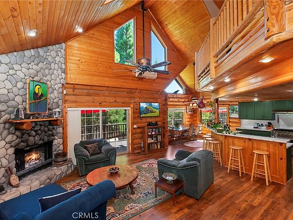 This 3-bedroom,2 1/2 bath home is a unique gem located in Deer Lodge Park, Lake Arrowhead and is the site of the historical Deer Lodge Park namesake. Only a few steps up to the front door, where you will step inside to a welcoming open concept floor plan with high ceilings and numerous windows bringing in a lot of natural light. The living room has a stone fireplace and a sliding glass door to the wraparound deck; the recently updated kitchen has all new appliances including a chef's 6-Burner Range and granite counters. Duel eating areas include the dining room with views of the garden and the counter space that seats 6 people. You will also find the primary bedroom with ensuite bathroom on this level. From the kitchen, you can go through a door to the laundry room and then out to the back of the house. The upper level has two more bedrooms, a full bathroom and a bonus area. The current owner has done numerous updates including adding solar panels, a mini-split Air Conditioner, the wraparound deck, the second shed, landscaping, outdoor lighting, a Catio and more. Parking in the front on a slightly sloped driveway, and more parking in the back under the carport. Easy parking for your RV or boat too!! Solar energy panels cover 95-100% of electricity costs!!!!!