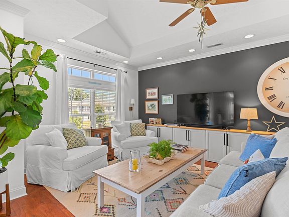 No fault on the seller...This beautiful home is back on the market! Welcome to your serene escape in the heart of Market Common - where charm, comfort, and convenience converge. This 4 bedroom, 3 bath home offers pond and pool views along with thoughtful details that make everyday living feel like a retreat. The inviting first floor entrance welcomes you to 2 bedrooms, a full bath and a laundry area for added ease. A private patio off one of the bedrooms is the perfect spot for morning coffee or evening unwinding. Wood flooring runs through the main living areas and staircase, creating a warm and cohesive aesthetic. Upstairs, light pours into an open-concept living space that seamlessly flows to a covered porch overlooking peaceful water views. The kitchen features stainless steel appliances, stylish backsplash, and plenty of space of casual meals. The primary suite offers an escape with a beautifully decorated full bath and a walk-in closet, while an additional bedroom and full bath provide flexibility for guests or a home office. This home includes a 2-car garage, carpeted bedrooms for added comfort, the HVAC unit for the upstairs was replaced in 2020, new toilets installed in all three bathrooms along with new faucets in July 2025. Located just minutes from shopping, top dining spots, and the beach, it offers a lifestyle that's as vibrant as it is laid-back.