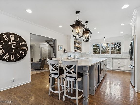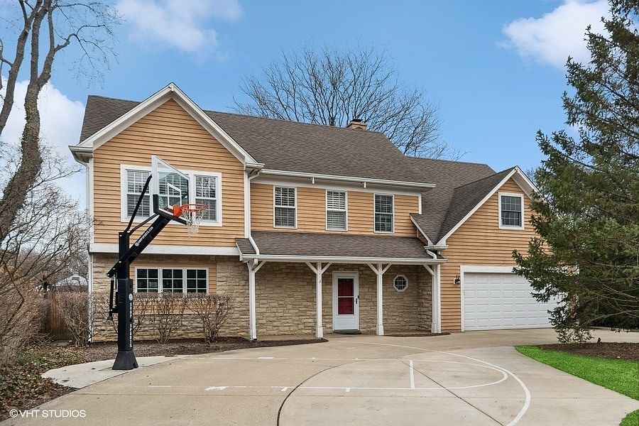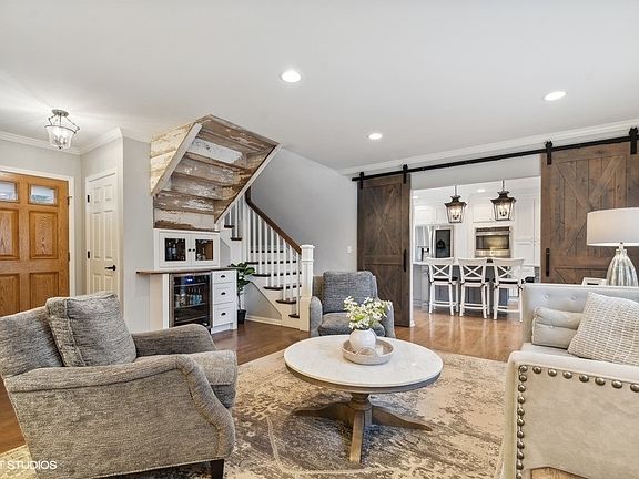 Updated and move-in ready 4 bedroom, 2 full and 1 half bath home located in desirable Sherwood Forest. This home exudes casual living and comfort. First floor has inviting living room with fireplace and custom built-in bar with beverage refrigerator. Expansive solid wood barn doors lead to a STUNNING farmhouse kitchen featuring custom white wood cabinetry, stainless steel appliances, oversized island with storage and seating, quartz counters, subway tile backsplash, decorative wood shelving and eat-in area. Sun-filled family room with walls of windows and door that leads to expansive patio. Hardwood floors throughout main living areas. Powder room and first floor laundry/mudroom leads to a 2-car heated garage with extended storage area. Second floor features a serene primary bedroom with vaulted beamed ceiling, hardwood floors, shiplap decorative wall and custom walk-in closet. Brand new (2021) modern farmhouse primary bath with double vanity with storage, quartz counters, large shower with rain shower head and separate make-up area. Three additional bedrooms all with hardwood floors (one currently used as a home office) share updated hall bath. Bonus room is the perfect kids' recreation room or exercise room with two built-in storage areas. Easy stair access to large attic for tons of additional storage. Huge brick paver patio with built-in fire pit and professionally landscaped fully fenced yard with WIFI controlled sprinklers and outdoor lighting. In-ground gas line for BBQ and fire pit. This home is the perfect space for entertaining with family and friends!