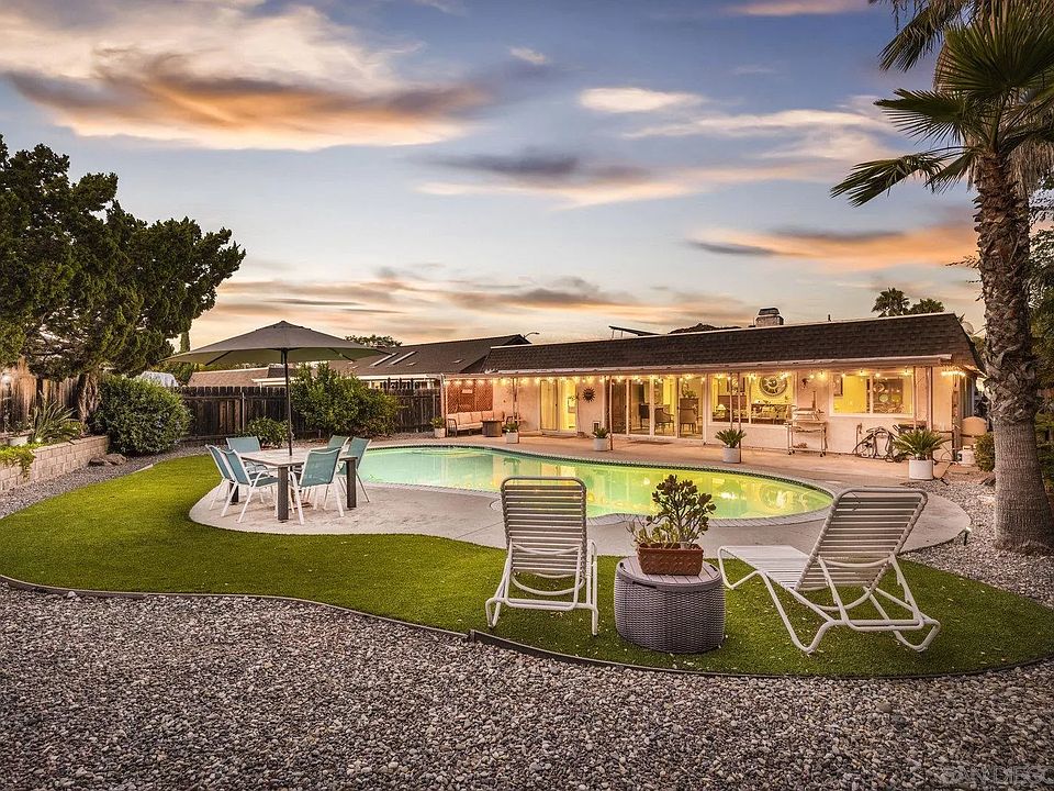 Experience the perfect blend of indoor-outdoor living in this bright, open-concept home within Poway's highly acclaimed school district, renowned for academic excellence. This unique residence features a dramatic central atrium with skylight and welcoming entry skylight. The seamless floor plan flows from the front entrance to the pool patio, creating an ideal entertaining space. The spacious layout showcases soaring 10-foot ceilings in the master bedroom, atrium, and living room. Large windows throughout flood the home with natural light. The living space features a striking brick accent wall with fireplace, creating a warm focal point. The impressive kitchen boasts granite countertops, stainless steel appliances, and abundant storage space. The grand kitchen island overlooks and opens to both the living area and backyard. A separate drink counter with additional cabinetry and wine fridge adds entertaining convenience. Step outside to your well-maintained backyard featuring a sparkling pool, large covered patio, beautiful landscaping, and mature trees—perfect for hosting gatherings. The large primary bedroom includes an ensuite bathroom, mirrored closet, and sliding door leading to the private backyard. Practical updates include an epoxy garage floor, enhanced storage solutions throughout and leased solar system. Located just one block from beloved Old Poway Park with its historic train, weekly farmers market, and frequent festivals. Walk to exceptional schools including Midland Elementary, with easy access to Twin Peaks Middle School and Poway High School. This prime.. location puts you within Poway's highly acclaimed school district, making it a sought-after destination for families prioritizing quality education. The walkable neighborhood provides convenient access to hiking trails, two major shopping areas, and public transportation. This exceptional property combines modern comfort with small-town charm in one of Poway's most desirable locations.