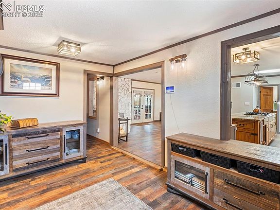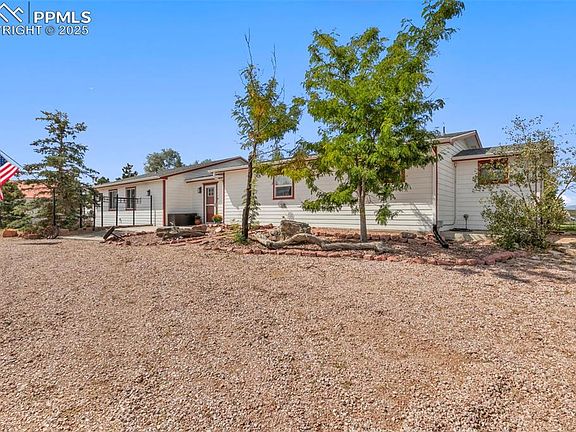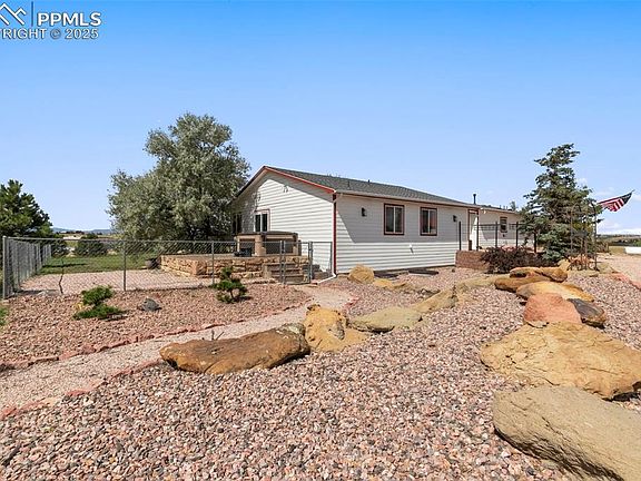 Welcome to this ranch-style retreat set on 35 acres atop a quiet cul-de-sac, just twelve minutes from Falcon. Step into a spacious main level that flows seamlessly with new flooring (2025). The living area is bright and inviting and the updated smart switches add a modern touch. The kitchen features a refrigerator, stove, and dishwasher, all updated in 2023, with plenty of workspace and storage. The primary suite and additional bedrooms are conveniently located on the main level. The bathrooms shine with thoughtful renovations—one updated in 2022 and another in 2024. Downstairs, you’ll find plush, high-end carpet (2022) and generous living areas ideal for entertainment or relaxation. A refreshed laundry room (2025), dual-zone heating with a new upstairs furnace, and central A/C for the main living spaces ensure year-round comfort. Dual hot water heaters, a whole-house fan, and a 50-amp generator inlet with lockout add peace of mind. Step outside to take in panoramic mountain views of Pikes Peak on the new concrete patio. The exterior boasts a new roof (2022), new storm doors (2024), dog doors opening to a fenced backyard, and a septic system installed in 2022. Thoughtfully designed outbuildings, including a fully concreted drive-through shop, 12-foot chain-operated doors, separate power, water at both ends, and 50-amp 220V service. Detached 3-car garage. Additional sheds provide storage, including a renovated 12x20 building with a built-in chicken coop and a 10x10 for outdoor gear. Horse enthusiasts will appreciate the loafing shed with adjoining paddock, over 25 acres of fencing, and standpipes in the pastures. There are also three hydrants across the property, RV hookups with septic cleanouts, and a shooting range for recreation. With no HOA or covenants, this property offers unmatched freedom. All outbuildings feature durable metal roofing, and updated garage electrical (2023) ensures functionality for projects big and small.