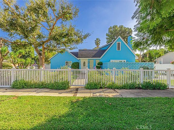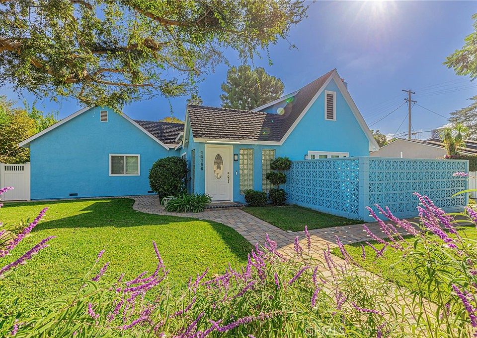 WELCOME! to 14156 Califa Street Sherman Oaks, an elegant single-story corner-lot residence that epitomizes refined Valley living. Behind its charming white picket fence lies a beautifully landscaped sanctuary adorned with fruit-bearing trees and lush greenery, setting an inviting and graceful tone from the moment you arrive. Step through the foyer framed by striking glass-block walls into a bright, open interior defined by high ceilings, gleaming hardwood floors, and timeless plantation shutters. The spacious living room, illuminated by recessed lighting and framed by dual-pane French doors and windows, centers around a Cozy classic fireplace creating a warm yet sophisticated atmosphere ideal for both relaxation and entertaining.