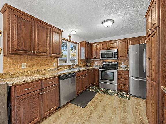 Step inside this well-maintained rambler featuring 3 bedrooms plus an office—easily convertible to a 4th bedroom with the addition of an egress window—and 2 remodeled bathrooms. The updated kitchen showcases newer cabinets and countertops, pull-out drawers, stainless steel appliances, garbage disposal, and newer vinyl plank flooring. Enjoy the comfort of newer maintenance-free vinyl windows, updated metal siding, and new LeafFilter gutters for easy upkeep. The main bath offers a stylish tiled shower, while the home’s high-efficiency furnace ensures year-round comfort. Additional highlights include a finished storage room, oversized double garage, a fully fenced backyard with two new gates, and a two-tiered deck, perfect for outdoor entertaining. With lots of mature trees this property provides a sense of privacy and relaxation. With numerous updates completed between 2009 and 2015, this move-in ready home blends modern updates with lasting quality and charm.