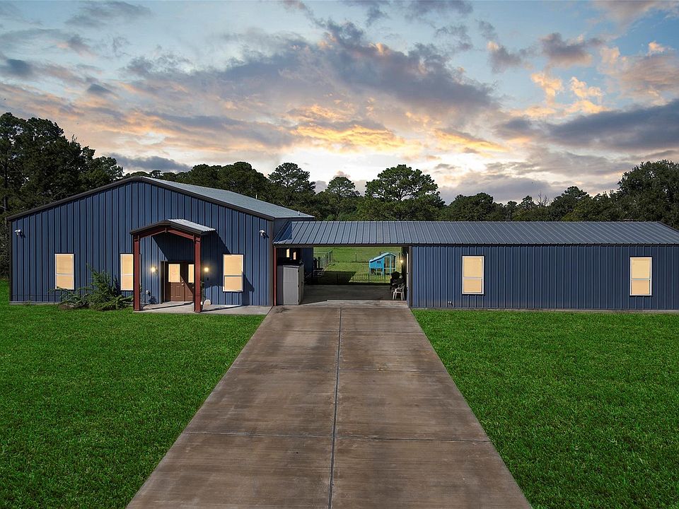 Discover ultimate Custom Living in Santa Fe! This meticulously crafted barndominium is located in a highly coveted Santa Fe location, offering easy highway access to I-45 for a seamless commute. The one-of-a-kind split-design layout guarantees privacy, featuring 3 beds/2 baths in the main home and a fully equipped adaptable suite with 2 additional baths in a separate wing—perfect for a private office, game room, or guest house! A gorgeous, sheltered breezeway patio connects these spaces for effortless indoor/outdoor entertaining. The dream kitchen boasts a large stainless sink, custom backsplash, a pot filler and beautiful blue soft-close drawers. Situated on 2.1 beautifully cross-fenced acres, this 2022 build is secured by a "forever" metal roof and 400 ft well for ultimate independence. Experience custom luxury and prime location—schedule your tour today!