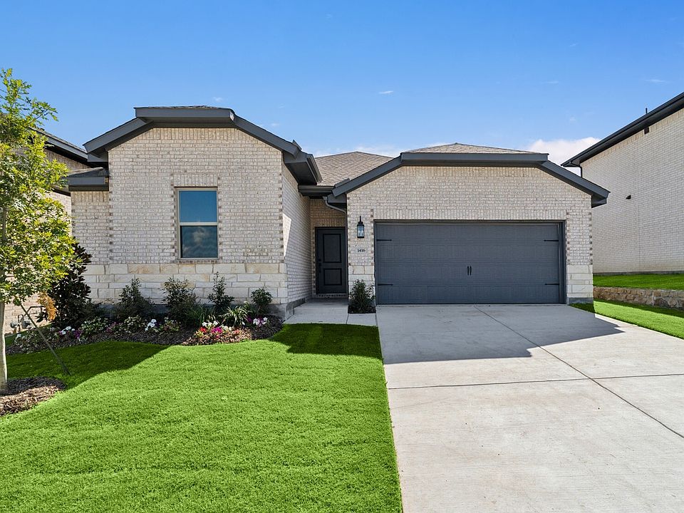 Amazing new construction single-story home in Howe ISD! Move in ready single-story with an Extra Suite Plus - including private bath and living room. This professionally curated home with K. Hovnanian's desirable Farmhouse looks palette showcases dark stain shaker cabinets, quartz countertops, laminate flooring, and black metal shade pendant lights. A cozy fireplace anchors the great room. Spend time in the primary suite, your own personal oasis located at the back of the home with large walk-in closet and private ensuite bath. Wind down at the end of the day by spending time on the shady covered patio, just off the main living space.