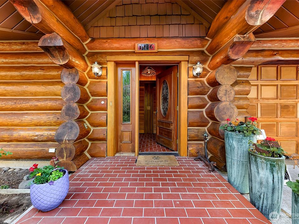 True log homeSpiral stairsRadiant heated floorsRaised garden bedsHand-collected skagit river rockPark-like settingGorgeous archways