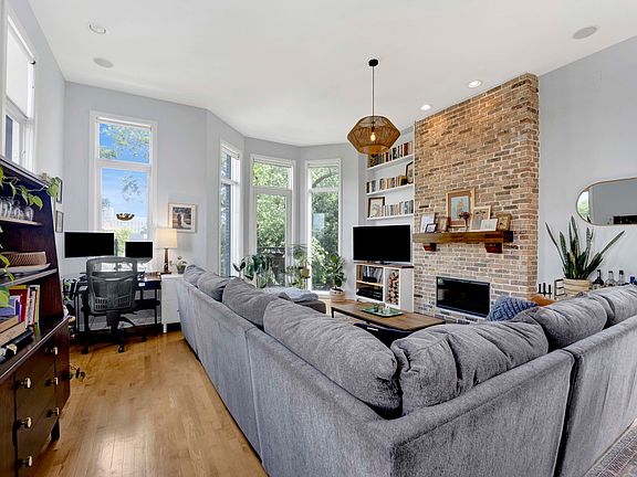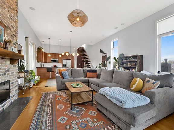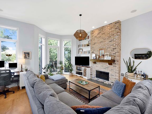 Step inside this sun-drenched home located on a tree-lined block in Chicago's vibrant West Town! This exceptional residence is a rare blend of architectural volume and relaxed elegance. Soaring ceilings, surrounded by oversized windows on all four walls, set the stage for a space that feels like you're living inside a luxurious treehouse. Designed with entertaining in mind, the expansive living area is anchored by a striking brick fireplace and built-in shelving and features built-in surround sound throughout (including rooftop). The open-concept layout flows seamlessly from living to dining to kitchen, where you'll find honed granite counters, stainless appliances, and a generous peninsula, perfect for pouring cocktails or perching with your morning coffee. The primary suite is tucked privately in the back and features a walk-in closet, oversized windows, and direct access to a quiet balcony. Its spa bath is equipped with a dual vanity, deep soaking tub, and glass-enclosed shower. A second full bath and bedroom complete the main level, offering ample flexibility for guests, work, or winding down. Take your interior staircase to a private rooftop oasis, complete with a pergola, built-in bar, gas and water hookups, and turf designed with both lounging and four-legged friends in mind. There's even a dedicated doggy door for easy access. With no neighboring roof decks on either side, you'll enjoy an unmatched sense of privacy by day and unobstructed skyline views by night. The home is complete with garage parking, a storage room, and a shared backyard.