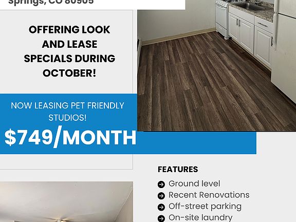 This studio has everything you need for comfortable living! No upstairs neighbors, dedicated parking, and proximity to downtown makes Colorado Springs living great!