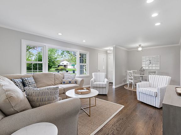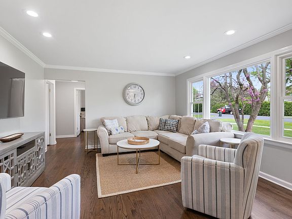 Move right in and enjoy this stunningly updated ranch home nestled in sought-after East Glenview-just moments from top-rated schools, scenic parks, the revitalized downtown area, Metra station, and with easy access to I-94 for a seamless commute. The home's charming curb appeal features crisp white-painted brick paired with elegant navy blue siding. Step inside to a warm and inviting entryway with a coat closet, opening into a spacious living room filled with natural light. Rich dark hardwood floors, crown molding, updated windows, and recessed LED lighting set the tone for a sophisticated yet comfortable living space. A bright dining area with a stylish brushed gold light fixture flows into the beautifully updated kitchen-complete with white shaker cabinets (including 42-inch uppers), gleaming quartz countertops, stainless steel appliances, classic subway tile backsplash, and a generous center island with seating. The kitchen opens to a versatile bonus space, ideal as a family room or casual lounge, featuring locker storage, wraparound windows, and designer lighting accents. The main level boasts three generously sized bedrooms, each with hardwood floors, crown molding, ample closet space, and updated windows. A tastefully renovated full bathroom features gray tile flooring, an oversized white vanity with quartz countertop, and a tub/shower combo with modern subway tile surround. Downstairs, the fully finished entertainment basement offers incredible bonus space with wide-plank white oak luxury vinyl flooring throughout. Enjoy a second family room, a flexible game or fitness area, and a show-stopping custom bar complete with handcrafted Amish cabinetry, quartz counters, and a built-in beverage fridge. The lower-level bathroom is equally impressive with a steam shower, bench seating, white oak vanity, quartz countertop, and elegant tile finishes. Additional highlights include an attached, drywalled garage with durable epoxy flooring and a beautifully manicured yard with expansive stamped concrete patio. This home checks every box-style, location, updates, and space. Don't miss your chance to make it yours!