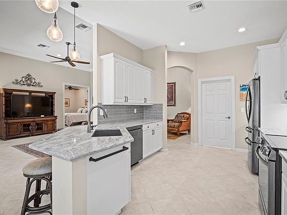Welcome to this exceptional lakefront and golf-course home in the highly sought-after Caravella neighborhood of Palmira Golf & Country Club. Perfectly positioned on the signature hole Osprey #8, this residence will WOW you from the moment you walk in with its breathtaking long lake views. The most impressive view in all of Palmira! This beautifully and impeccably maintained home offers 3 bedrooms, 2 baths, and 1,920 sq ft of light-filled living space with an open great-room floor plan. Great for an investment opportunity- rented for February and March 2026 for 20k. Thoughtfully updated throughout, it features plantation shutters, crown molding, tray ceilings, and a completely renovated kitchen with new appliances, quartz countertops, and custom cabinetry. Additional upgrades include a new roof (2022), new A/C (2021), new washer & dryer, central vacuum, and electric hurricane shutters for peace of mind. The spacious screened lanai showcases a custom wood-plank ceiling, picture-frame enclosure, and a sparkling saltwater pool & spa with new pool pump (2023), new heater, and updated spa lighting—a true outdoor oasis designed for entertaining and relaxation. Residents enjoy access to the Renaissance Center Club, offering a lagoon-style resort pool, 75’ Olympic lap pool, 8 hydro-clay tennis courts, 5 bocce courts, pickleball, indoor & poolside dining, and a state-of-the-art fitness & wellness center. Golf memberships are optional. Conveniently located near Bonita Beach, Coconut Point, and RSW Airport, this home blends luxury, comfort, and the ultimate Florida lifestyle in one of Bonita Springs’ premier communities.