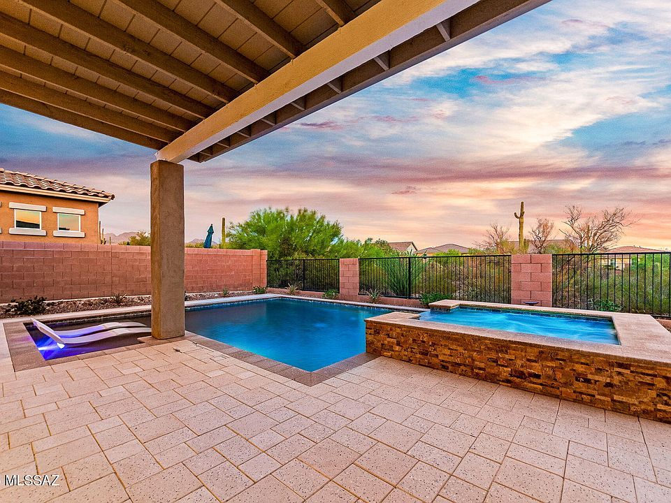 Resort-like living awaits at this Dove Mountain property, nestled within the gated community of Golden Barrell Place. The backyard is an entertainer's dream, offering a seamless indoor-outdoor lifestyle. A 12-foot roof extension on the back patio provides constant shade in every season. With a custom heated pool and spa, built-in BBQ, a dedicated prep area, and a gas fire pit, this backyard is perfectly set up for a full-time resident or seasonal visitor.Completed in 2017 this versatile single story with a 3-car garage, 2,904 square feet, 4 bedrooms, a den, and 3 bathrooms allows for a variety of uses. This home lays out beautifully with a split-floorplan creating privacy and functionality in each of the spaces. Interior features include a spa-like primary bathroom shower, ceramic tile throughout all public spaces, fully enclosed den or office, staggered kitchen cabinetry, large walk-in pantry, prep area or coffee bar space and soaring 12 ft ceilings in the great room capturing natural light and desert views. Outside you will find its custom patio roof extension that provides shade over a portion of the pool and outdoor kitchen. The limestone pavers create continuity throughout the outdoor spaces for a clean and finished look. Step up to the built in gas fire pit to enjoy the views of the Tortolita Mountains and watch the sky change colors at sunset.
