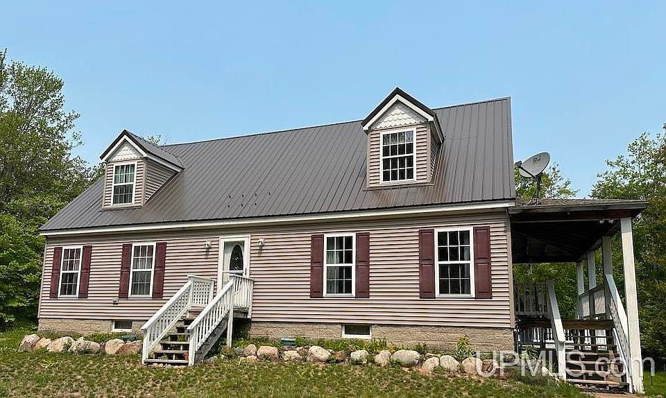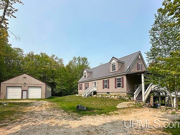 Welcome to peaceful living on 9+ acres in Grand Marais, MI. Four bedrooms, 2 full bathrooms, with large living areas. This home has plenty of room for family and guests! Dormer windows in the upstairs bedrooms. New metal roof and the furnace is just one year old. Covered decks, with a full sun deck to enjoy nature. Stargazing is a must on clear nights! Plenty of sky for stars, auroras, and marveling at nature. A huge pole barn for parking and toys. Two additional outbuildings for garden equipment and storage. Less than 2 miles to town... but still far enough away. Unwind and then rewind the memories made in this peaceful home. By appointment only.