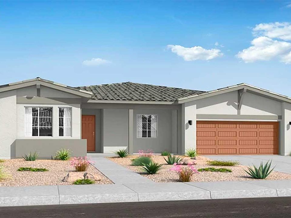 MLS#6746380. December Completion. The 50RM1 floorplan at Raveena at Rancho Mercado offers a beautifully designed single-story layout with 3 bedrooms, a versatile flex room, 2.5 bathrooms, and a 3-car garage, all within 2,226 square feet. Step into the foyer and experience the open-concept design that seamlessly connects the spacious gathering room, dining area, and gourmet kitchen, complete with double ovens, a 30-inch gas cooktop, and 42-inch cabinets. The outdoor living area is perfect for al fresco dining and family gatherings. The private owner's suite features dual vanities and an expansive walk-in closet. The flexible room provides an ideal space Structural options include: extended covered patio, paver front porch and driveway, alternate AC location with gate, soft water loop, and 30" gas cooktop w single oven.