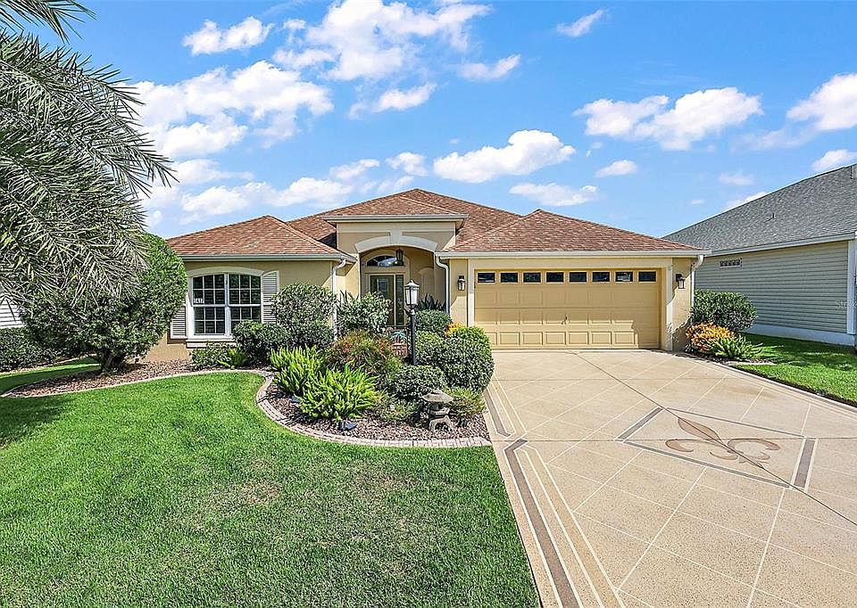 Ideally located in the middle of everything you would ever want or need, quickly, by golf cart, this "Elm" designer has ALL of the upgrades and is located in East Gilchrist just north of Brownwood. Upon arrival, you'll notice the fresh exterior paint, the epoxy-finished driveway and sidewalk, and the professional landscaping that frames the home beautifully. Stepping through the glass entryway into the spacious foyer, you are immediately drawn to the spacious, vaulted living room and the adjacent, enclosed lanai with a summer kitchen and exceptional privacy due to the enhanced landscaping in the back yard. Luxurious crown molding, Plantation shutters, and custom flooring throughout the home add a level of uncommon elegance. A gourmet kitchen adjoins the living room and dining room, and is the heart of this home, with granite counters, beautiful cabinetry, custom lighting above and below the wall cabinets, pull-out drawers in the lower cabinets, a custom sink, a brand new microwave with air fry and convection, a custom, drop-in, smooth top range, and an island which makes food prep a breeze. Immediately adjacent to the kitchen is the laundry room, complete with front-loading washer and dryer, both on spacious drawers, and there is abundance of cabinetry, plus a custom, fold-down folding table. The bedrooms are in a split configuration. The master features a Palladian window, an exceptionally-large, custom walk-in, granite counter and custom vanity cabinetry, and secluded commode and the popular Roman shower. Far away from the master you'll find the guest bedrooms and guest bath, all behind a sliding door for extra privacy. The bath, like the master bath, features granite and custom cabinetry, plus an access door to the enclosed lanai. Oh, the lanai? Enclosed with full-height sliders, an epoxy floor and a wet bar complete with refrigerator. The garage includes a whole-house water conditioning system and a spare refrigerator. Outside, you'll be amazed at the level of landscaping, with a variety of beautiful plants which are beautiful both day and night, thanks to extensive accent lighting.