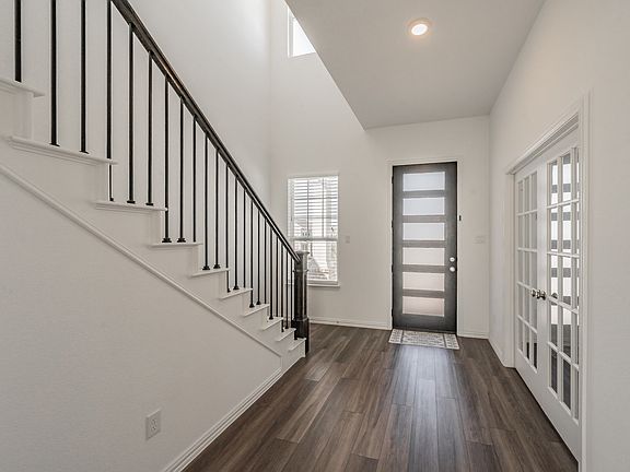 Gorgeous Two-Story Home in Highly Desired Pecan Square! This like-new, barely lived-in home combines modern style with everyday comfort in the heart of Northwest ISD. Featuring 3 bedrooms, 2.5 baths, a formal dining area, office nook, and game room, this versatile floor plan offers space for every need. Enjoy beautiful curb appeal with a welcoming front porch and a bright, open interior showcasing luxury vinyl plank flooring throughout the main areas. The chef’s kitchen is the centerpiece of the home, complete with a large island, quartz countertops, white shaker cabinets, a stunning herringbone backsplash, stainless steel appliances, and a pantry. The spacious living room flows seamlessly into the dining area, which features elegant French doors for added charm.Upstairs, a cozy game room provides the perfect retreat for relaxing or entertaining. The primary suite includes double undermount sinks with extra counter space, a tiled shower, and a large walk-in closet. Step outside to the covered back porch and private backyard—ideal for gatherings or quiet evenings at home. The rear-facing garage with extra parking adds convenience, while the award-winning Pecan Square community offers resort-style amenities including pools, multiple playgrounds, a barn for activities, sidewalks, walking trails, and more.