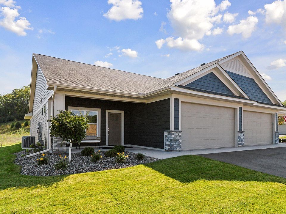 Welcome to the beautiful Thompson Heights neighborhood of River Falls. Conveniently located close to downtown River Falls with easy access to I-94 and the WI/MN border. Marvel at this Derrick Homes custom-built twin home offering our Sockeye slab on-grade floorplan with 2 bedrooms and 2 bathrooms. The main floor highlights an open and airy layout with luxury vinyl plank in the kitchen and living room. Upgrades include Custom Derrick quality built to-the-ceiling kitchen cabinets, tile backsplash, quartz countertops in kitchen and bathrooms, soft close drawers, and stainless-steel appliances. The spacious primary suite features a private bath with a walk-in shower stall & dual sink vanity. An additional bedroom could double as an office space. Enjoy cozy evenings next to the fire in your sunroom and summer days on your 12 x 18 patio. A laundry room and an additional full bath complete the space. Leave the snow removal and lawn care to the association. Do not miss your opportunity to see this gorgeous home. Book your showing today!