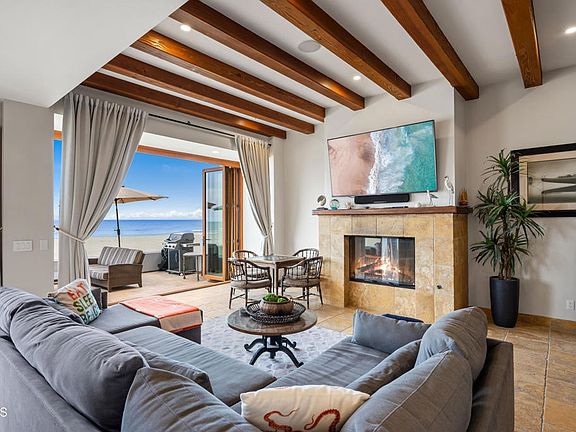 Welcome to your dream Beachfront house, perfectly nestled on the sands of beautiful Mandalay Beach. This gem is situated on a semi-private street, west of the main beachfront road, ensuring less car and foot traffic for a peaceful, beachy vibe. Positioned on a west-facing beach, the house offers breathtaking sunsets every evening. Enjoy panoramic 180-degree views of the ocean, islands, whitewater, and coastline, stretching across the Santa Barbara channel to the Channel Islands and the Ventura coastal foothills. Step into the gourmet kitchen, a chef's paradise, featuring a center island, a 48-inch Viking cooktop, a Viking double oven, and a built-in Subzero refrigerator. The first level dazzles with a wall of windows that open fully to a spacious deck, providing direct access to the sand and creating an inviting indoor-outdoor living experience. The family room exudes coastal charm with high vaulted beamed ceilings and a cozy fireplace. This level also offers three bedrooms and three baths, along with a den off the kitchen that could serve as an optional sixth bedroom. The second level is dedicated to a generous primary suite, featuring a fireplace and a private deck. The primary bathroom is a sanctuary with a jetted tub, steam shower, fireplace, and, of course, stunning ocean views. For an unforgettable evening, head to the rooftop deck to marvel at the starry skies, making it the perfect spot to entertain and relax while savoring the refreshing ocean air.The home boasts 3-zone radiant heating and a rare 6-car garage, ensuring comfort and ample space. This Beachfront beauty offers an unparalleled coastal living experience with spectacular vistas and serene surroundings. Don't miss your chance to own this slice of paradise!