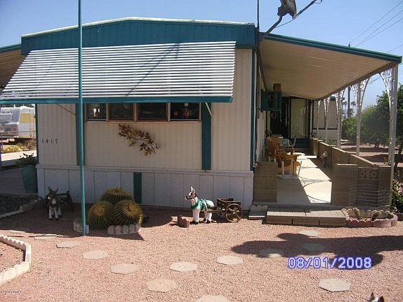 Cute little 1982 2 bedroom 1 bath well taken care of manufactured singlewide home on a large corner lot in Apache Junction. All appliances included & some furniture. Complete RV hook up & slab. 15X12 screened AZ room and a 10X12 attached workshop. A variety of high producing citrus trees. Property is connected sewer. Awesome winter visitor''s home in great condition.