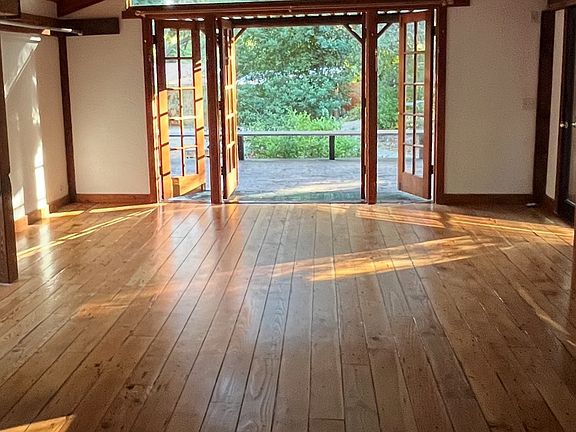 Bathed in natural light, the home features wood floors and ceilings, stained glass windows, and abundant glass that blurs the line between indoors and out.
