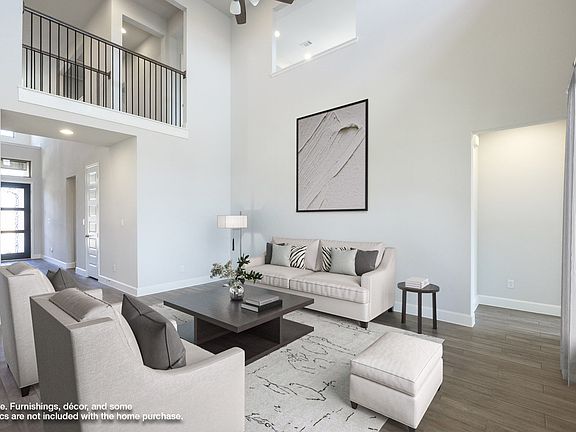 Front porch opens into a two-story entryway with a double front door and grand staircase. French doors enclose the private home office. The utility room is conveniently located off the main hallway. The family room boasts extended ceilings and a wall of windows. The kitchen has an island with built-in seating, 5-burner gas cooktop and a walk-in pantry. The dining area is embraced by a corner wall of windows and allows entrance into the extended covered backyard patio. The primary bedroom boasts three large windows. French doors open into the primary bathroom which hosts dual vanities, a garden tub, glass enclosed shower, and two walk-in closets. Upstairs you are welcomed by a game room and secondary bedrooms. Completing the home is a guest suite tucked beyond the mud room which features a full bathroom. Two-car garage. Representative Images. Features and specifications may vary by community.