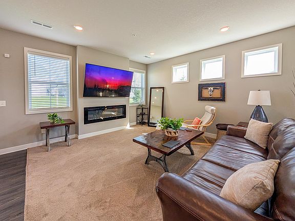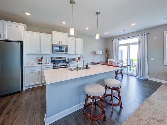 Better than new construction! All New Carpeting throughout! Welcome to this fantastic end-unit townhome with 2 car-garage. Enjoy the green space out the sliding glass door for relaxing on nice evenings on the patio or let your dog out. This "almost new" unit features an upgraded kitchen with white cabinetry, quartz countertops, center island with undermount sink, and upgraded stainless appliances. The nicely sized informal dining area fits a full size dining table. Living area includes TV mount, a beautiful LED fireplace (that produces heat), and tons of windows to let the light shine in. The upper level includes three spacious bedrooms including a primary bedroom with attached 3/4 bath, double vanities, and walk-in closet along with a shared bath and laundry room. Brand new Lifetime Fitness just a short walk away and new Quik Trip just opened right down the road. Move right in and enjoy!