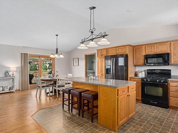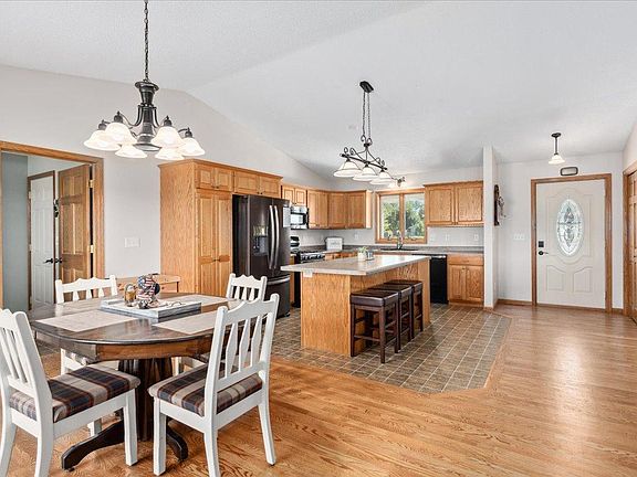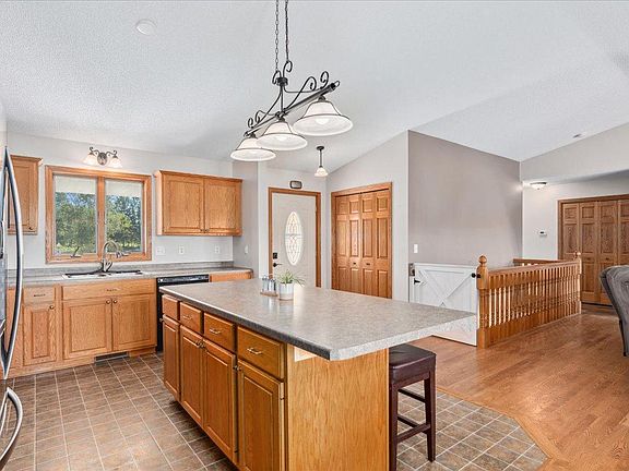 Seeking some space to breath, yet still under 10 minutes from the conveniences of town? Look no further! Your sturdy rambler with a walk-out basement, featuring multiple outdoor living spaces, is here. Walking in, be welcomed by the open and spacious main living area, complete with vaulted ceilings, massive kitchen island, and gorgeous hardwood floors. Offering 3 bedrooms & 2 bathrooms on the main level - including an updated owner's suite with beautiful tiled shower & walk-in closet - the functionality of this home is outstanding. Head downstairs for a spacious family room, cozy with impressive gas fireplace, featuring large wetbar - all just waiting for gatherings of family and friends! The lower level also provides generous 4th bedroom, bathroom, and enormous unfinished storage space. Don't miss the 2023 10x16 storage shed and finished & heated 3-stall garage! Complete with oversized 9-ft garage door. To top it all off, this property is a gardener or homesteader's dream. Fenced in garden space awaits, along with multiple fruit trees (apple, pear, cherry, plums, oh my!), berry bushes (strawberry, raspberry, blueberry), and perennial asparagus, rhubarb, and mojito mint. This home offers something for everyone. Come see it for yourself today!