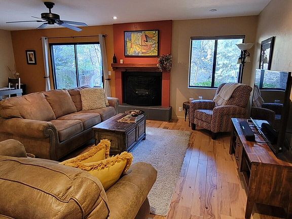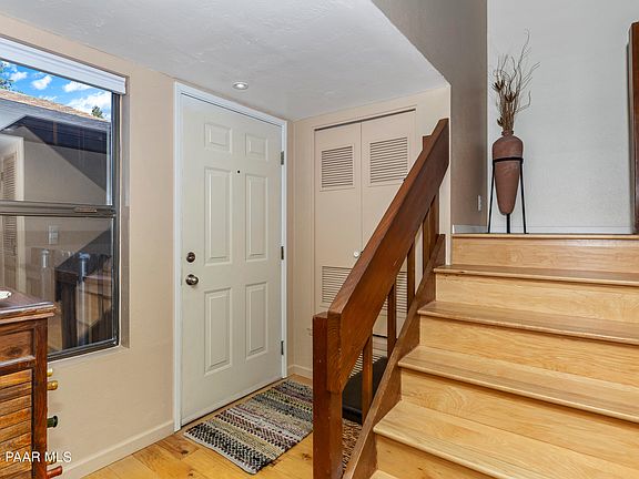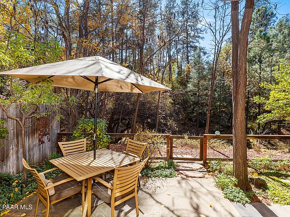 Gorgeous updated townhouse only two miles from downtown Prescott backing up to a seasonal creek with tall pines and open space. Beautiful hickory wood flooring throughout. Open concept with cozy gas fireplace in the large living and dining area with views of the lovely landscaped back patio. The kitchen is updated with custom cabinets, countertops, appliances, and breakfast bar. Upstairs features a roomy primary bedroom with en suit bath and a balcony over looking the creek, guest bedroom, guest bath, and laundry closet. Enter the home from the 2 car garage thru the courtyard. Enjoy alfresco dinning on the peaceful back patio oasis of flowers & foliage watching the wildlife walk by. Great location close to hiking/biking trails & shopping. Immaculate & move in ready! HOA dues