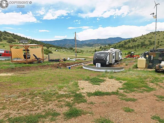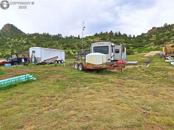 Imagine waking up on 5 acres of peacefulness, surrounded by mountain views and no HOA. Here you are afforded the ability to enjoy the included 33', 2017 Heartland Mallard Camper with an upgraded 15,000 BTU A/C and an auxiliary propane heater for snowy winter nights. The 55" tv and entertainment system are included with (2)-30lb propane tanks and electric lift jack. In your spare time, there is 30'x46' Steelmaster Quonset Hut with an industrial base connector that can be assembled to provide cover for the RV or your recreational vehicles. The electric is connected, a 1,000-gallon rock and tube septic installed and a trailered 550-gallon water tank with a stationary 210-gallon water tank stay with the land. A little over 2 acres have an electric (solar) fence with an 8'x14' covered shelter and water line. Use the washer and dryer hookups in the 7'x12' wired container and rest on the detached deck with sunshades and porch swing. There is a Kubota tractor that is negotiable that has maintained the road and property over the years with multiple implements. This recreational property will allow you to enjoy true mountain living.
